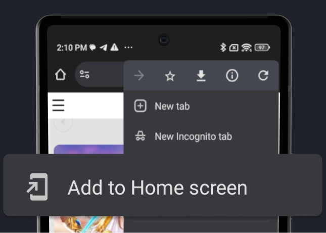 In browser menu press «Add to Home screen»